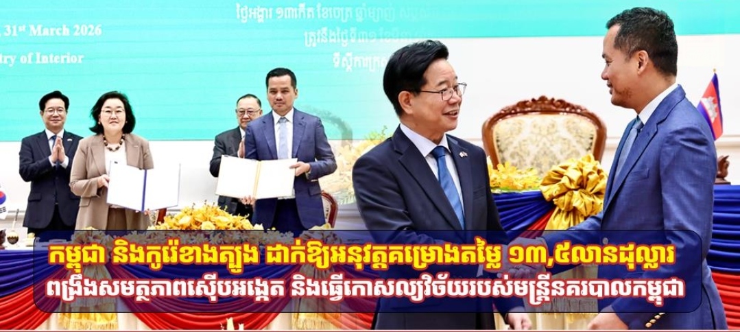 (ភ្នំពេញ)៖ នៅថ្ងៃទី៣១ ខែមីនា ឆ្នាំ២០២៦នេះ រដ្ឋាភិបាលកូរ៉េខាងត្បូង តាមរយៈ ទីភ្នាក់ងារសហប្រតិបត្តិការអន្តរជាតិកូរ៉េ (KOICA) និងក្រសួងមហាផ្ទៃ របស់កម្ពុជា បានចុះហត្ថលេខាជាផ្លូវការលើកំណត់ត្រានៃការពិភាក្សា (RD) សម្រាប់ «គម្រោងពង្រឹងសមត្ថភាពការស៊ើបអង្កេតកន្លែងកើតហេតុ (CSI) និងវិទ្យាសាស្ត្រកោសល្យវិច័យរបស់មន្ត្រីនគរបាលកម្ពុជា។