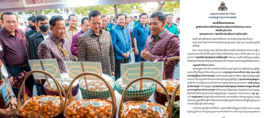 (ភ្នំពេញ)៖ តាមរយៈសារលិខិតអបអរសាទរ ក្នុងឱកាសទិវាជាតិលើកកម្ពស់ការប្រើប្រាស់ផលិតផលខ្មែរ ៩មេសា លើកទី៩ ឆ្នាំ២០២៦ ក្រោមប្រធានបទ «ខ្មែរផលិត ខ្មែរប្រើប្រាស់ ខ្មែររីកចម្រើន» សម្តេចបវរធិបតី ហ៊ុន ម៉ាណែត នាយករដ្ឋមន្ត្រីនៃកម្ពុជា បានជំរុញឱ្យបងប្អូនប្រជាពលរដ្ឋខ្មែរ គាំទ្រប្រើប្រាស់ផលិតផលក្នុងស្រុក ដែលផលិតដោយខ្មែរ។