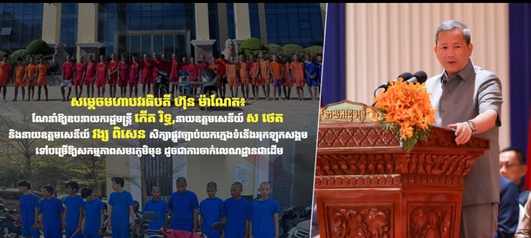 (ភ្នំពេញ)៖ សម្តេចបវរធិបតី ហ៊ុន ម៉ាណែត នាយករដ្ឋមន្ត្រីនៃកម្ពុជា បានណែនាំឱ្យឧបនាយករដ្ឋមន្ដ្រី កើត រិទ្ធ រដ្ឋមន្ត្រីក្រសួងយុត្តិធម៌, នាយឧត្តមសេនីយ៍ ស ថេត អគ្គស្នងការនគរបាលជាតិ និងនាយឧត្តមសេនីយ៍ វង្ស ពិសេន អគ្គមេបញ្ជាការនៃកងយោធពលខេមរភូមិន្ទ សិក្សាផ្លូវច្បាប់យកក្មេងទំនើងអុកឡុកសង្គម ទៅបម្រើឱ្យសកម្មភាពសមរភូមិមុខ ដូចជាការចាក់លេណដ្ឋានជាដើម។