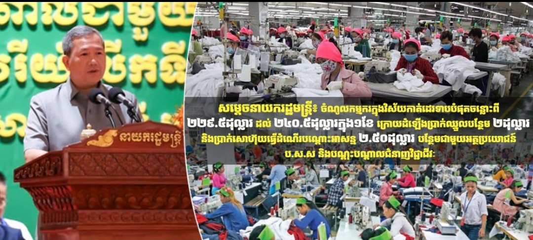 សម្តេចបានថ្លែងយ៉ាងដូច្នេះថឆ «មកដល់ពេលនេះ ប្រាក់ចំណូលជាក់ស្តែងរបស់កម្មករនិយោជិតក្នុងវិស័យវាយនភណ្ឌ កាត់ដេរ ផលិតស្បែកជើង និងផលិតផលធ្វើដំណើរ និងកាបូបទាបបំផុត ក្នុងចន្លោះ ២២៩.៥ដុល្លារ ពី ២៤០.៥ដុល្លារក្នុងមួយខែ ក្រោយពីរាជរដ្ឋាភិបាលសម្រេចដំឡើងប្រាក់ឈ្នួល ១ខែ ២ដុល្លារ និងប្រាក់សាហ៊ុយ ធ្វើដំណើរបណ្ដោះអាសន្ន ២.៥ដុល្លារ ក្នុងដំណាក់កាលដែលប្រេងឡើងថ្លៃធ្វើឱ្យការធ្វើដំណើររបស់បងប្អូនជួបប្រទះនូវការលំបាក ដើម្បីសម្រាលបន្ទុកជីវភាពរាជរដ្ឋាភិបាល និងវិស័យឯកជនក៏ជួយដោះស្រាយ»។