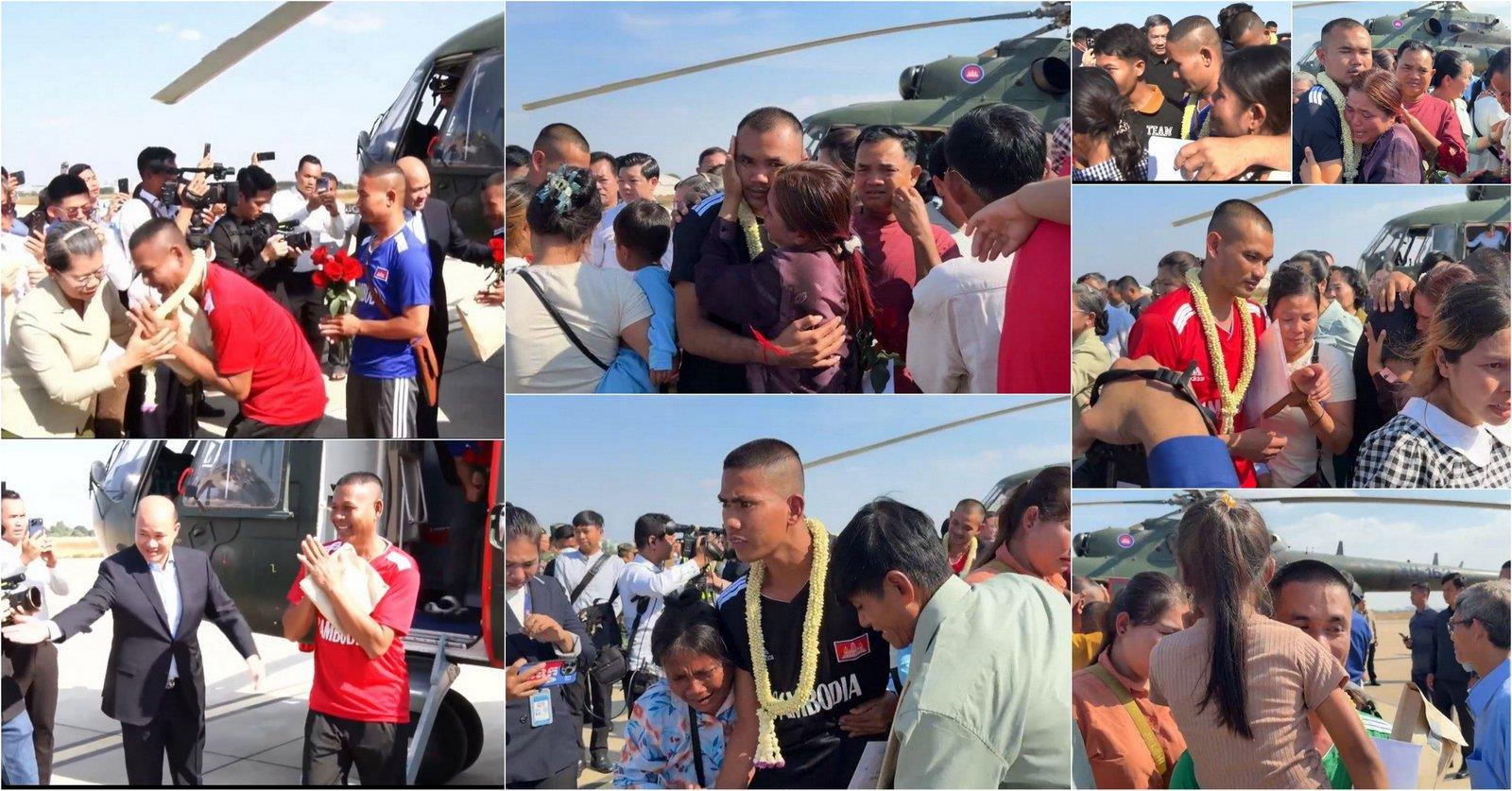 ភ្នំពេញ)៖ វីរៈកងទ័ពកម្ពុជា១៨រូប បានធ្វើដំណើរតាមឧទ្ធម្ភាគចក្រមកដល់រាជធានីភ្នំពេញហើយ ក្រោយភាគីថៃដោះលែងប្រគល់ឲ្យមកកម្ពុជាវិញហើយ នៅព្រឹកថ្ងៃទី៣១ ខែធ្នូ ឆ្នាំ២០២៥ បន្ទាប់ពីចាប់ខ្លួនអស់រយៈពេល១៥៥ថ្ងៃ ពោលគឺកាលពីថ្ងៃទី២៩ ខែកក្កដា ឆ្នាំ២០២៥៕
