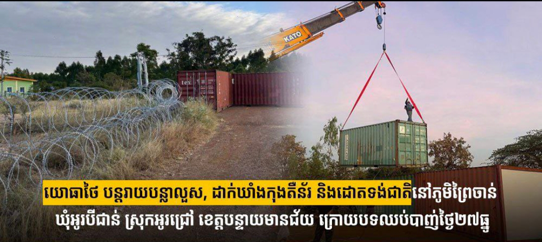 បន្ទាយមានជ័យ)៖ យោធាថៃ នៅថ្ងៃទី០៤ ខែមករា ឆ្នាំ២០២៦នេះ បានបន្តរាយបន្លាលួស, ដាក់ឃាំងកុងតឺន័រ និងដោតទង់ជាតិនៅភូមិព្រៃចាន់ ឃុំអូរបីជាន់ ស្រុកអូរជ្រៅ ខេត្តបន្ទាយមានជ័យ ក្រោយបទឈប់បាញ់ថ្ងៃទី២៧ ខែធ្នូ ឆ្នាំ២០២៥។