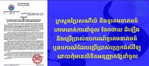 ភ្នំពេញ)៖ ក្រសួងប្រៃសណីយ៍ និងទូរគមនាគមន៍ បានចេញសេចក្តីជូនដំណឹង ស្តីពី ការហាមឃាត់ការនាំចូល ចែកចាយ ដំឡើង និងប្រើប្រាស់ឧបករណ៍ទូរគមនាគមន៍ ឬឧបករណ៍ដែលប្រើប្រាស់ហ្វ្រេកង់ស៍វិទ្យុ ដោយពុំមានលិខិតអនុញ្ញាតឱ្យនាំចូល។