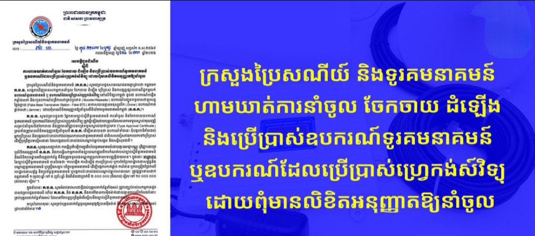 សេចក្ដីជូនដំណឹង បានឲ្យដឹងថា កន្លងមក ក្រសួងប្រៃសណីយ៍ និងទូរគមនាគមន៍ សង្កេតឃើញមានសកម្មភាពនាំចូល ចែកចាយ ដំឡើង ប្រើប្រាស់ និងការផ្សព្វផ្សាយពាណិជ្ជកម្ម លក់ឧបករណ៍ទូរគមនាគមន៍ ឬ ឧបករណ៍ដែលប្រើប្រាស់ហ្វ្រេកង់ស៍វិទ្យុ នៅលើទីផ្សារកម្ពុជា ដូចជា ឧបករណ៍បង្កើនកម្លាំងសេវា និង/ឬឧបករណ៍ពង្រីកសេវាគ្រប់ប្រភេទ (Booster/Repeater) ឧបករណ៍បញ្ជូនទទួលសេវាទូរសព្ទក្លែងក្លាយ (Fake Base Transceiver Station – Fake BTS) អាកាសយានគ្មានមនុស្សបើក (Drone) ឧបករណ៍កាត់ផ្តាច់សេវា (Jammer) ដោយពុំមានលិខិតអនុញ្ញាតឱ្យនាំចូលពីនិយ័តករទូរគមនាគមន៍កម្ពុជា (ន.ទ.ក.)។