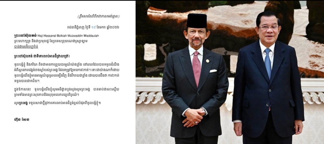 ភ្នំពេញ)៖ សម្តេចតេជោ ហ៊ុន សែន ប្រធានព្រឹទ្ធសភាកម្ពុជា នៅថ្ងៃទី១៩ ខែមករា ឆ្នាំ២០២៦នេះ បានផ្ញើសារលិខិតថ្វាយ ព្រះចៅស៊ុលតង់ ព្រះមហាក្សត្រ និងជាប្រមុខរដ្ឋ នៃប្រទេសព្រុយណេ ដើម្បីបួងសួងសូមព្រះអង្គ បានឆាប់ជាសះស្បើយ ព្រមទាំងមានព្រះសុខភាពនិងសុខុមាលភាពល្អបរិបូរណ៍។