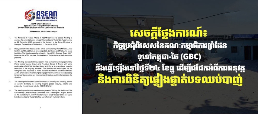 ម៉ាឡេស៉ី)៖ បន្ទាប់ពីបញ្ចប់កិច្ចប្រជុំពិសេសរដ្ឋមន្ត្រីការបរទេសអាស៊ាន ស្តីពីស្ថានភាពបច្ចុប្បន្នកម្ពុជា-ថៃ នៅទីក្រុងកូឡាឡាំពួ ប្រទេសម៉ាឡេស៊ី នៅរសៀល ថ្ងៃទី២២ ខែធ្នូ ឆ្នាំ២០២៥នេះ សេចក្តីថ្លែងការណ៍ប្រធានអាស៊ាន ស្តីពីលទ្ធផលនៃកិច្ចប្រជុំពិសេសនេះ ត្រូវបានប្រកាស។
