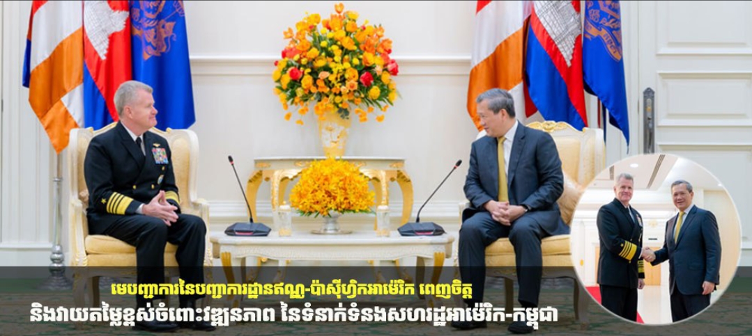 ភ្នំពេញ)៖ នាព្រឹកថ្ងៃទី២៦ ខែមករា ឆ្នាំ២០២៦នេះ សម្តេចមហាបវរធិបតី ហ៊ុន ម៉ាណែត នាយករដ្ឋមន្ត្រីនៃកម្ពុជា បានអនុញ្ញាតឲ្យ នាយឧត្តមនាវី Samuel Paparo មេបញ្ជាការនៃបញ្ជាការដ្ឋានឥណ្ឌូ-ប៉ាស៊ីហ្វិក នៃសហរដ្ឋអាម៉េរិក ចូលជួបសម្តែងការគួរសម និងពិភាក្សាការងារ នៅវិមានសន្តិភាព។